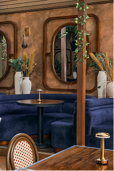 Interiors layered with plaster walls, millwork, and velvet seating in deep blue.